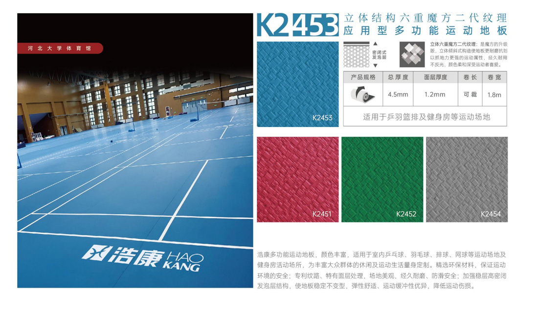 羽毛球、乒乓球、排球、網(wǎng)球、籃球、手球的比賽和訓(xùn)練場(chǎng)館、多功能場(chǎng)館、各類(lèi)健身房、舞蹈房、學(xué)校、單位工會(huì)活動(dòng)室、多功能廳、游樂(lè)園、幼兒園、體育用品商店、辦公室、賓館、醫(yī)院的任何地面(如水泥地、瓷磚、大理石、木地板等) 。