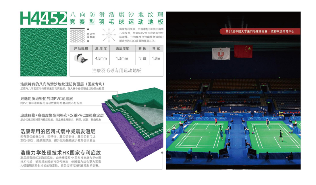 ⒊ 玻璃纖維加強(qiáng)層起到穩(wěn)定場地尺寸、延長使用壽命的作用,使地板永不收縮,性能更加穩(wěn)定,使運(yùn)動(dòng)員發(fā)揮出更好水平。